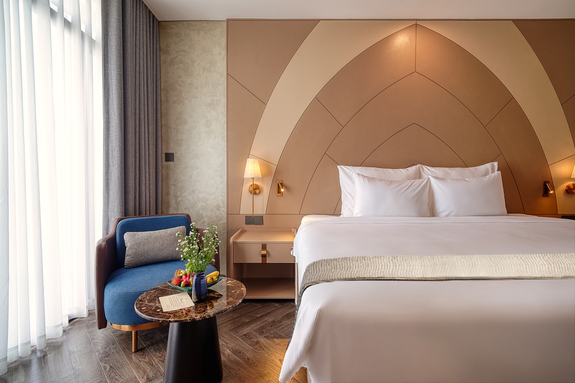 Located between the 4th and 8th floors of Champton Nha Trang Hotel, the Deluxe Rooms feature a stylish design palette of warm golden browns and refreshing ocean blues—bringing into your space the glow of sunshine, the scent of summer pine, and the vibrant spirit of the sea.