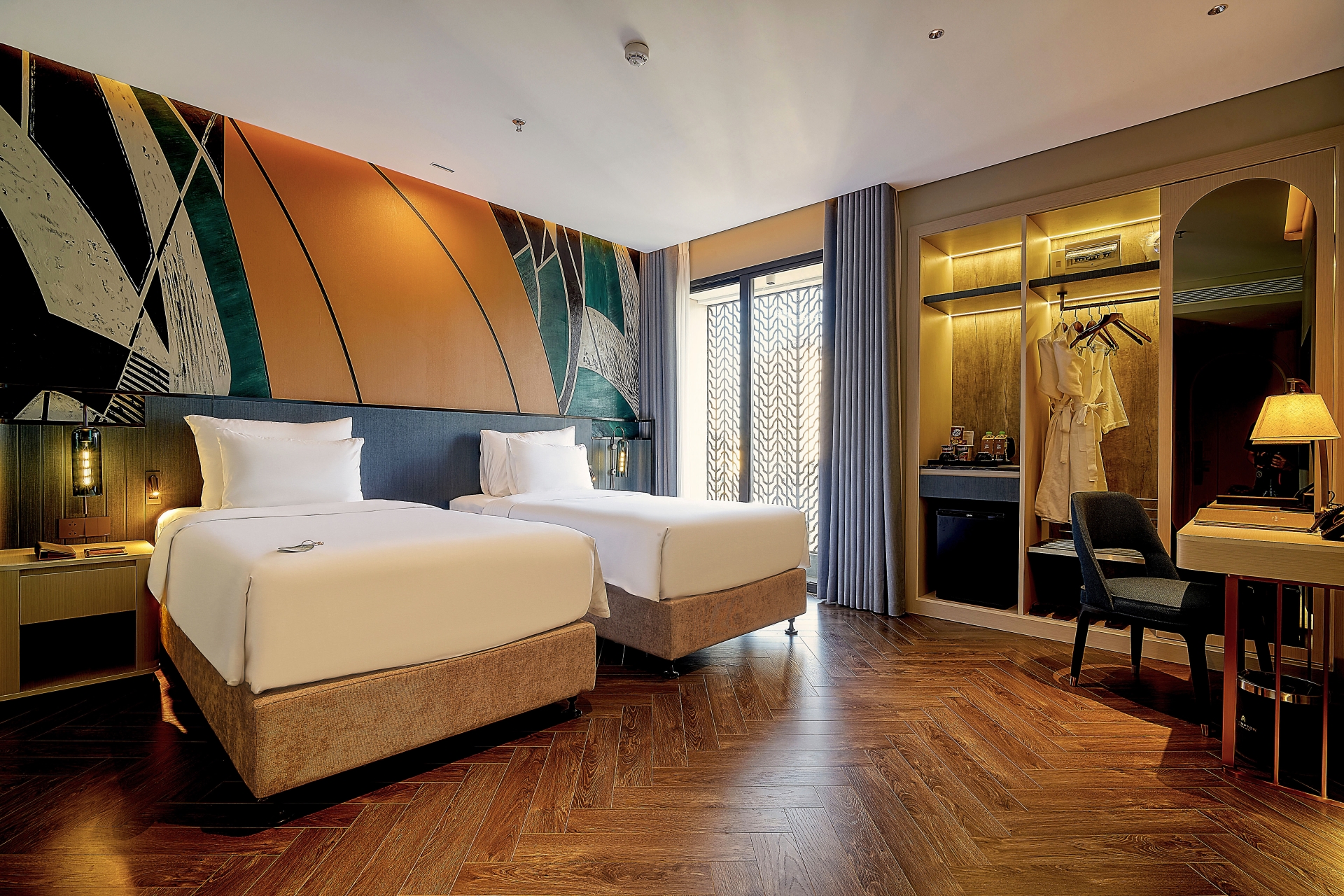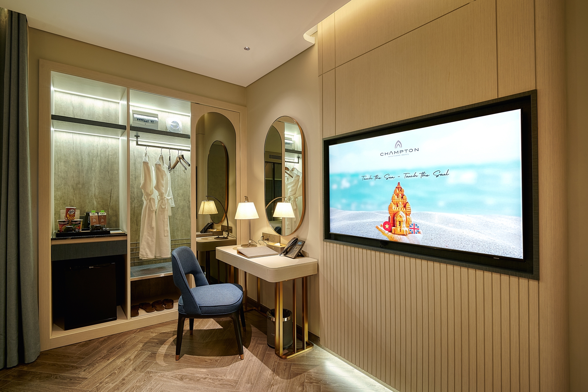 Located between the 4th and 8th floors of Champton Nha Trang Hotel, the Deluxe Rooms feature a stylish design palette of warm golden browns and refreshing ocean blues—bringing into your space the glow of sunshine, the scent of summer pine, and the vibrant spirit of the sea.